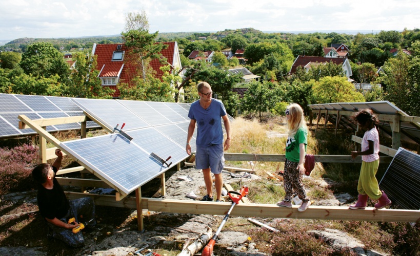 Bilden av ett hus som producerar mer el än vad hushållet gör av med är oftast en arkitektritad futuristisk villa med kraftigt isolerade väggar. Men de flesta av oss bor redan i ett hus som de varken vill riva eller flytta ifrån. Hur ska man då göra om man vill gå plus på elen? En kort färjetur från Saltholmen i västra Göteborg tar mig till Brännö, en av alla bilfria öar i den södra skärgården. Frånvaron av bilar skapar en Kråkmakargatsidyll där Jörgen Larssons sekelskiftesvilla passande smälter in, men det är knappast den mest energieffektiva hustypen. När jag kommer ut håller Jörgen och en kompis på att sätta upp några fler solcellspaneler på berget bredvid.